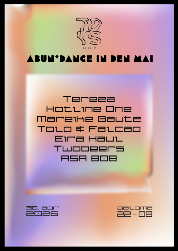 TOYS Berlin aims to be a safe space of personal and musical expression for everyone regardless of their gender, race, sexuality, (dis)ability, religion, class, age or body type. It is not a place for sexism, discrimination, queer-/trans-/homophobia, body shaming, misogynic behaviour, unwanted touching, sexual harassment, or violence. Please make sure there is consent before approaching any physical contact. If you should observe or experience an inappropriate situation, please don’t hesitate to let the promoters/ bouncers/ bar staff know and it will be swiftly dealt with. There will be an additional awareness crew in reflective vests and a little all gender intimacy space.